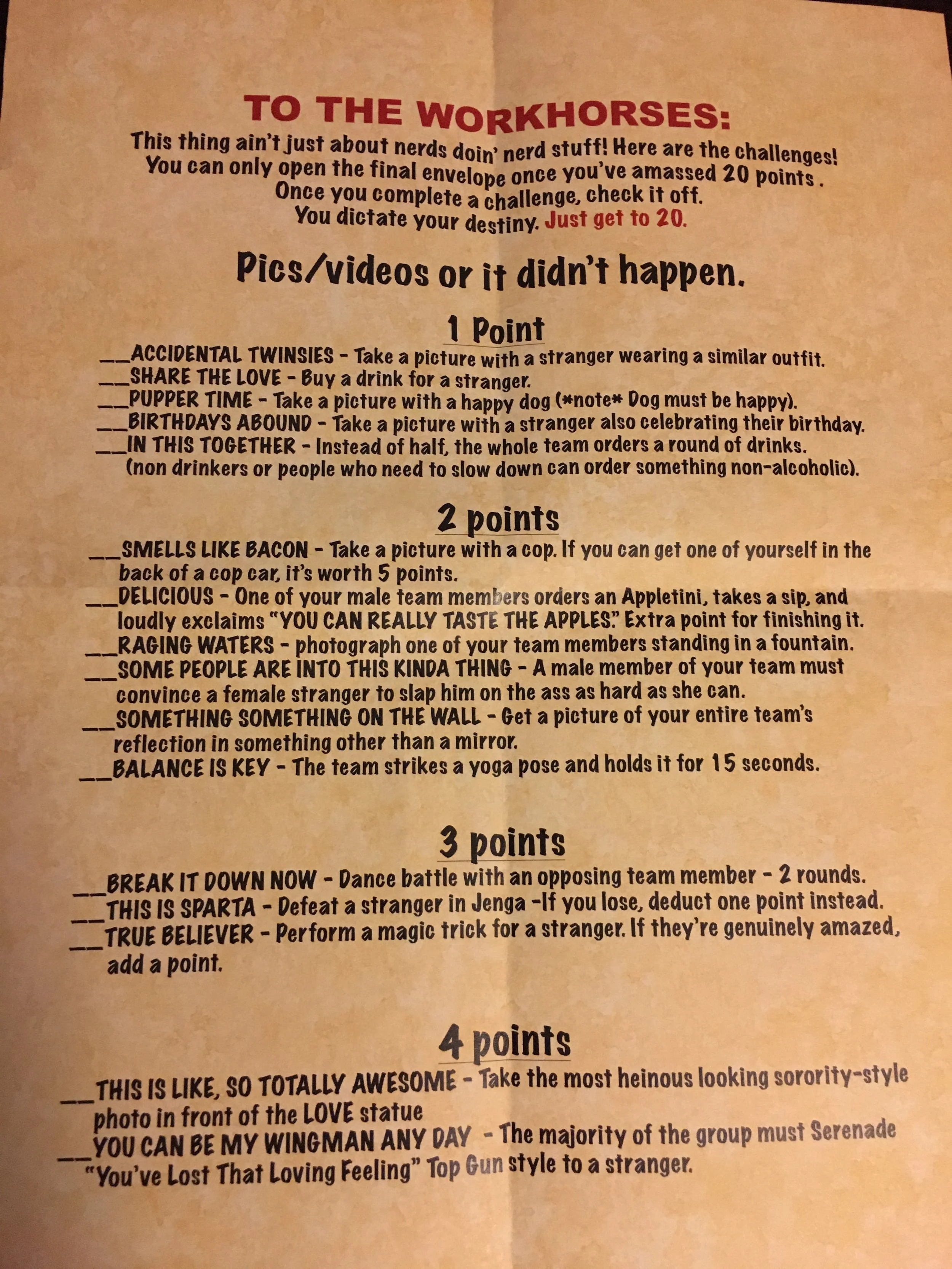 They were performing their task of being wild, rambunctious, and drunk. They were magnificent! You can see their task list to the right. It was the job of the chronographer to document and the broadcaster to send it to me so I could track the points