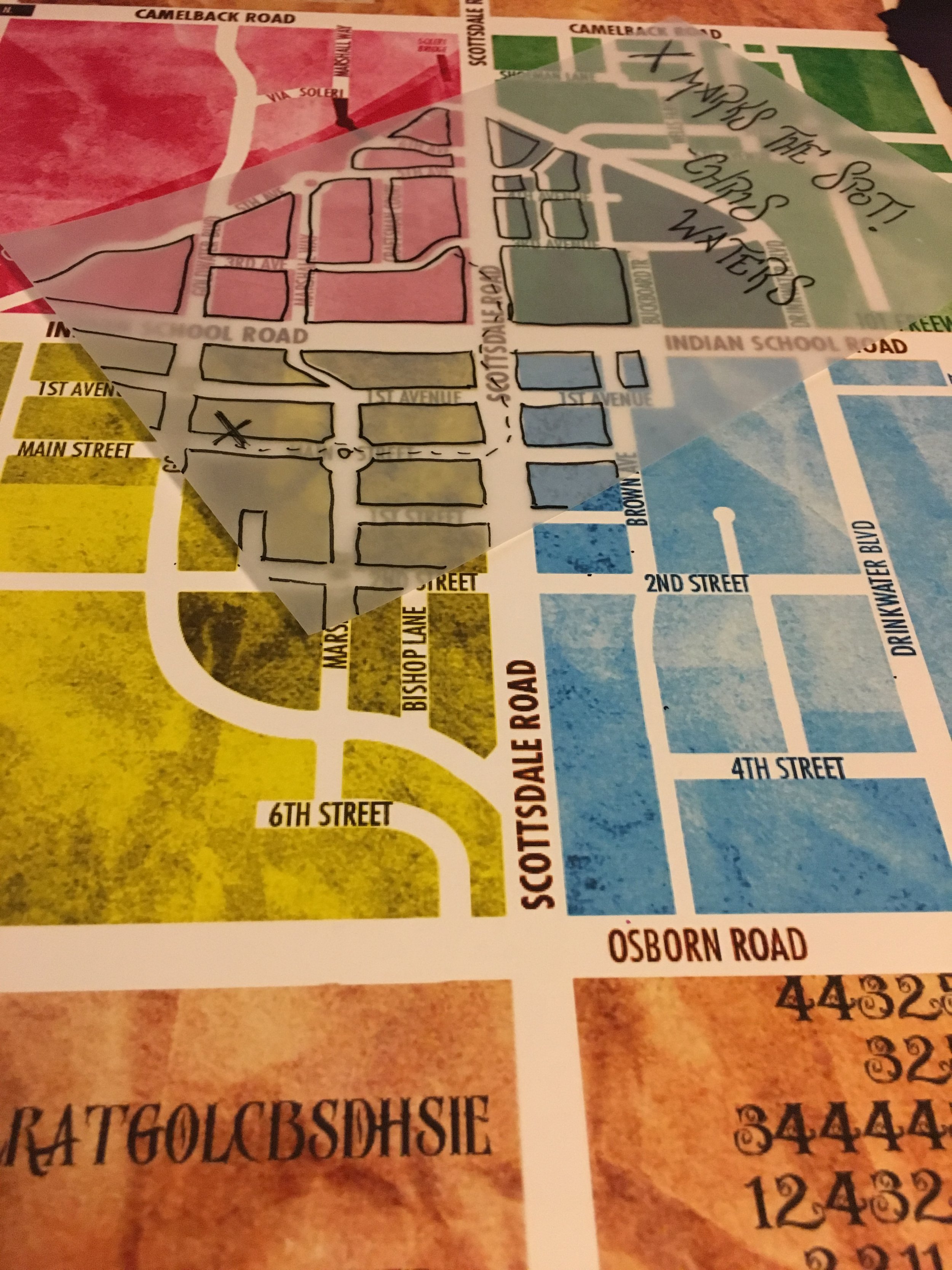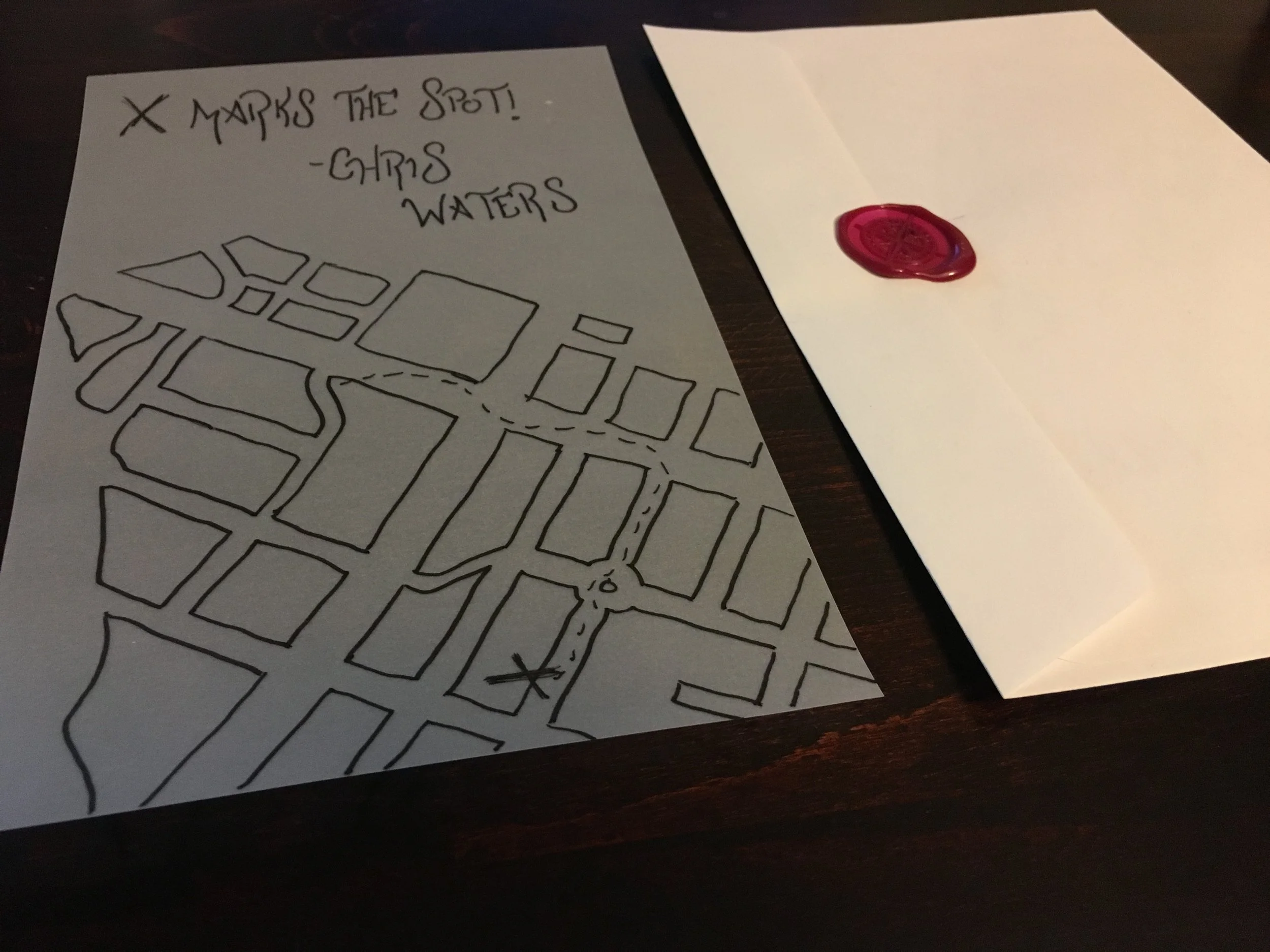 Once the phrase was completed, the team got a high five and one final envelope. This envelope contained a piece of Vellum paper with part of the map etched on. There was also a dotted line leading to a big X. Once they lined the vellum paper up on their map, they had their destination!