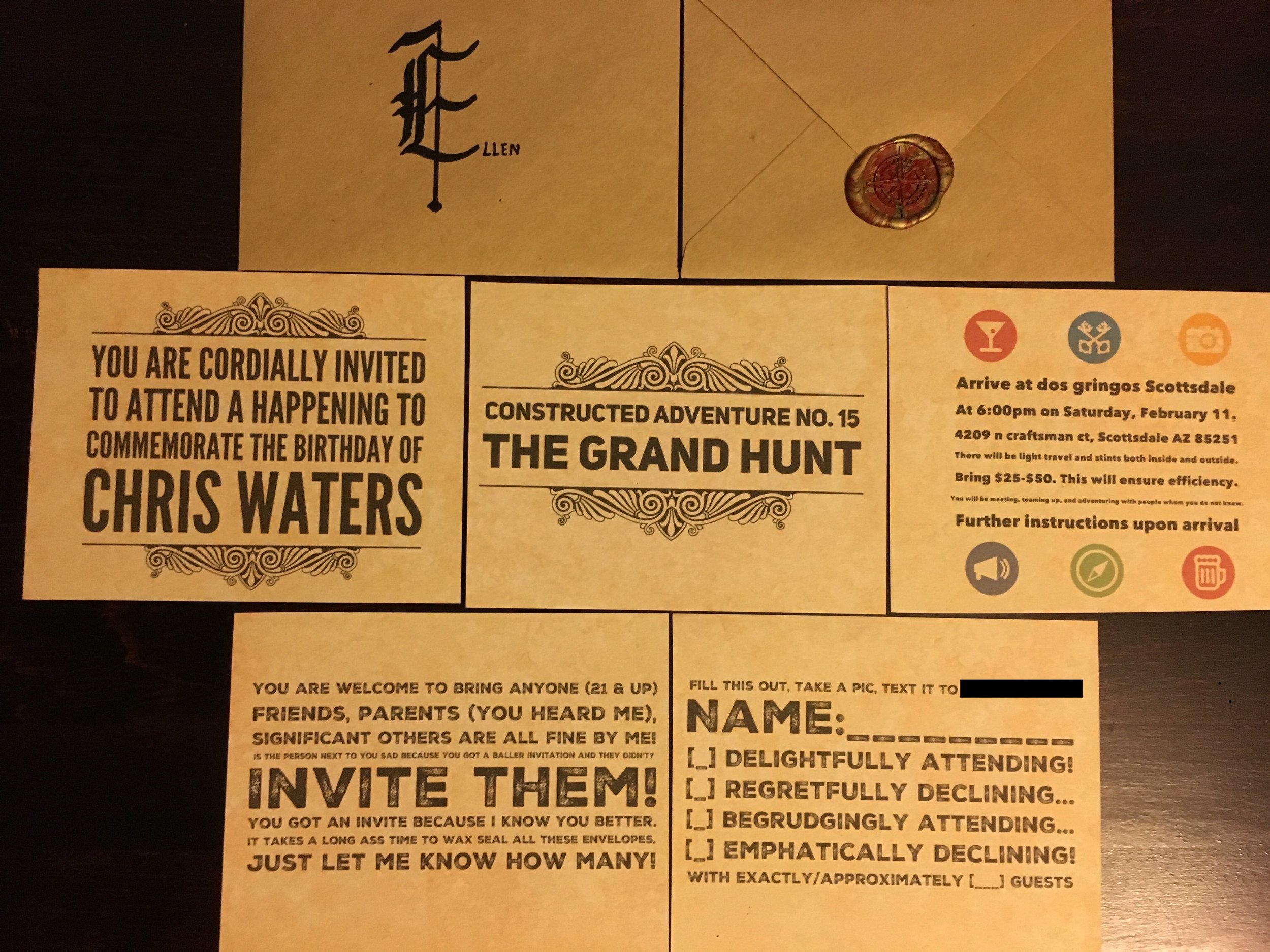 This is the only instruction people received. My invitees knew what I was capable of, but they weren’t given any other information except that it was going to be a treasure hunt of some sort, they will be traveling around, and they’ll probably get drunk. And boy did they ever!