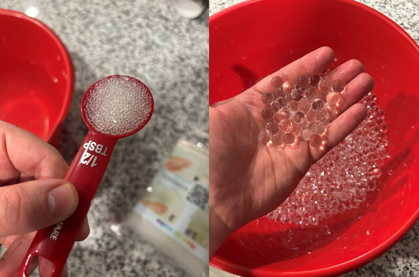 ) Prepare your water beads in advance. These tiny beads absorb water and will need to soak for about 24-hours. There are many different brands so make sure you follow the instructions on the package.