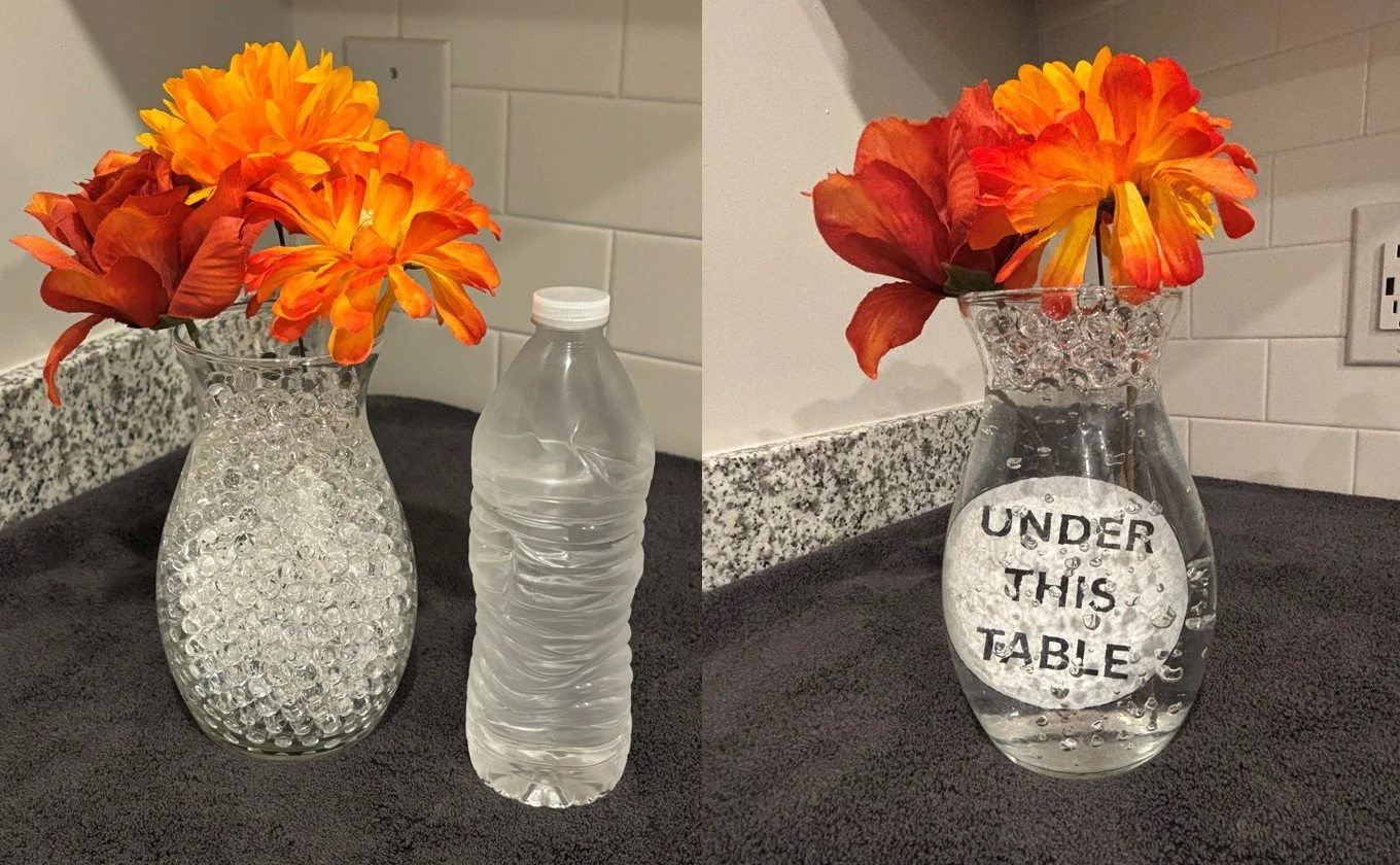 3.) Add your fully grown water beads, your waterproof clue, and some flowers (real or fake) into a vase. Make sure that your clue is positioned so that it is legible when the beads become transparent. I also recommend that you use a vase with a long neck. You don’t want your players reaching their hand in and plucking the clue out early.